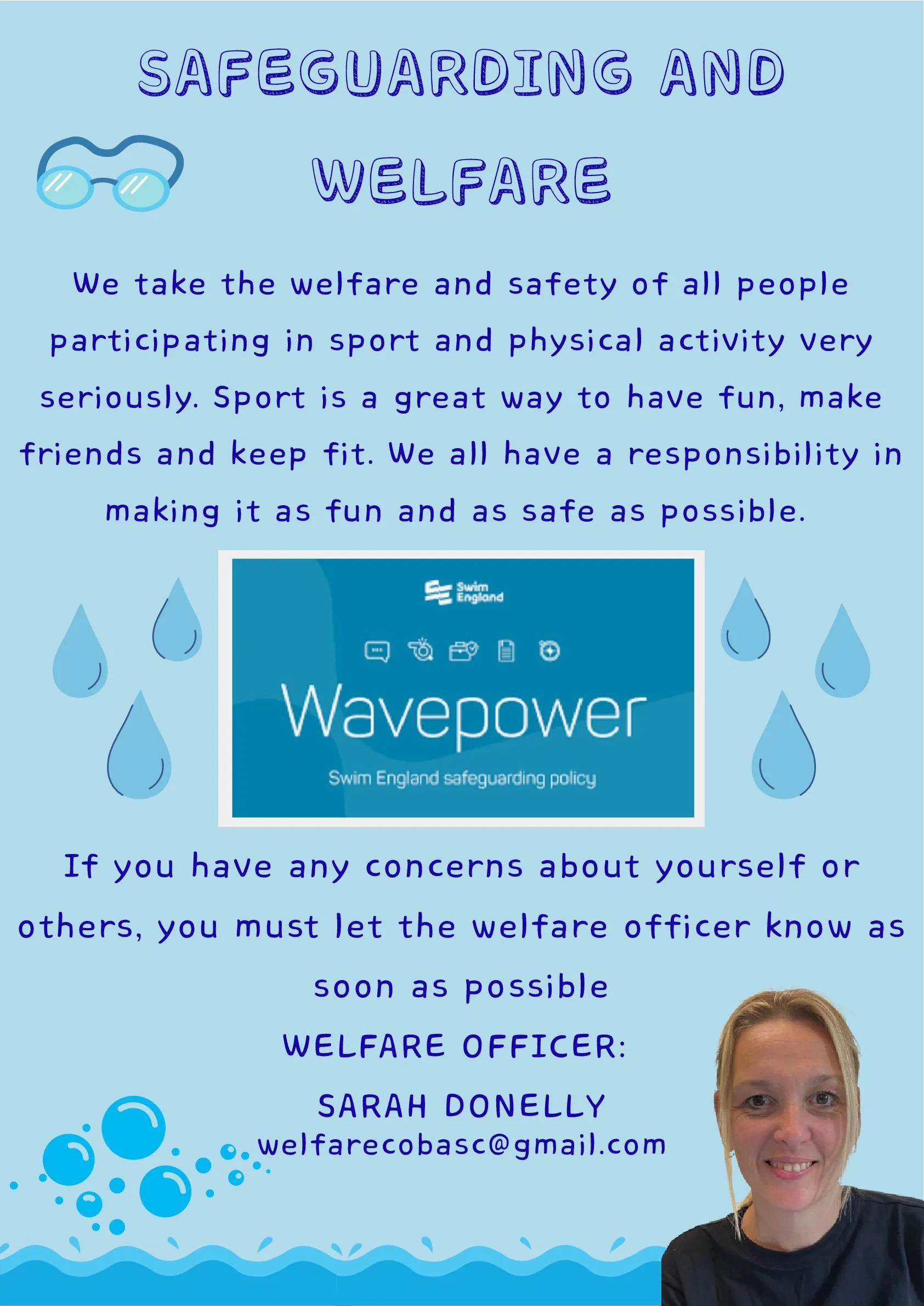 The Club supports and adheres to the Child Welfare in Swimming Procedures & Guidelines issued by Swim England. All of our coaches have are DBS checked and we have a Child Welfare Officer who should be the first point of contact if you have any concerns. Our Welfare Officer is Sarah.